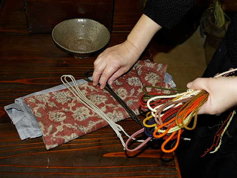 ※事故防止のため、宅配便による品物のお持ち込みはご遠慮ください。 - お客様のお好みをお聞きしながら、品物に合った裂(表・裏)・締め緒の取り合わせを決めます。