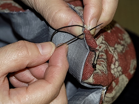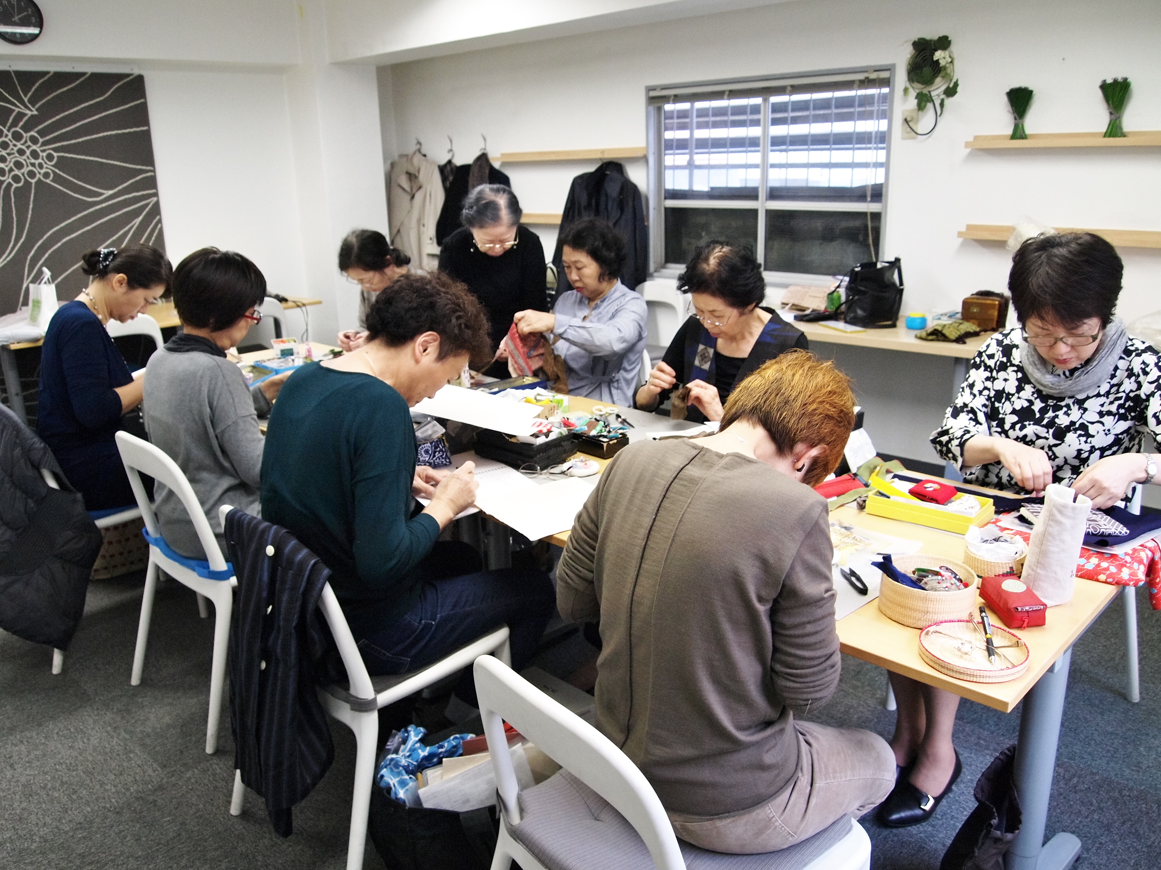 アンティーク目黒の仕覆教室で、門脇旭包先生の指導を受ける。